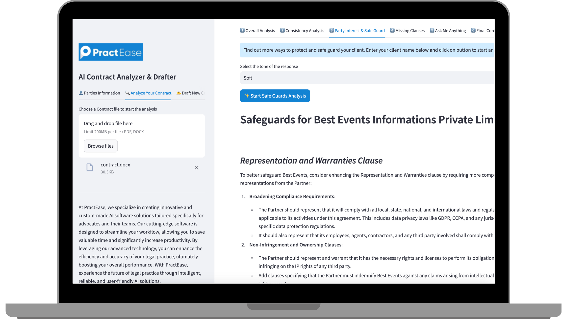 Generate comprehensive, tailored contracts in minutes. Analyze existing contracts for missing clauses and vulnerabilities, or draft new contracts from scratch with industry-specific templates.